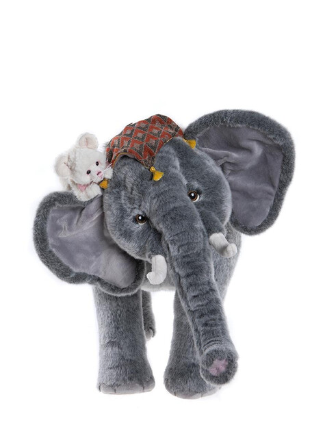 Piccadilly and Circus are a delightful plush duo that bring storybook magic to life with their exquisite craftsmanship and enchanting detail. Piccadilly, the elegant elephant, is expertly crafted from soft grey plush and fully jointed, allowing him to stand proudly on all four legs. His poseable trunk adds lifelike character, while a Middle Eastern-inspired head dress lends an exotic flair to his majestic stature. Perched playfully atop is Circus, a petite white mouse who is equally captivating, sporting a delicate and well-crafted design that perfectly contrasts the boldness of the elephant. Together, they form a theatrical and heart-warming duo, whether centre stage in a display or as beloved plush companions. Suitable for ages 3 years+. Limited in production to 1000. Elephant height: 43cm/17", Mouse height: 14cm/5.5".