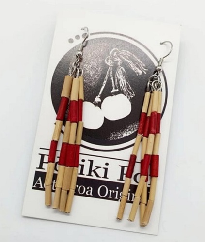 Each earing has four strands of piupiu in red and natural. They measure 5cm long, not including the hook.