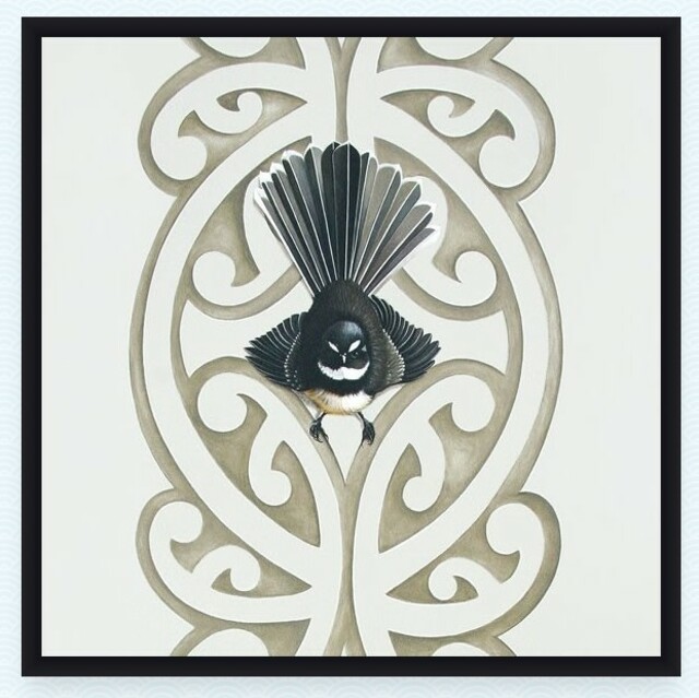 Beautiful artwork by one of our favourite artists, Jane Crisp. This print depicts the cheerful piwakawaka (fantail) against his kowhaiwhai. It's presented in a box frame which can stand on its own or be hung on the wall.