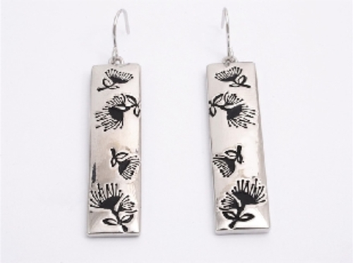 Silver coloured rectangular hook earrings decorated with pohutukawa silhouettes.