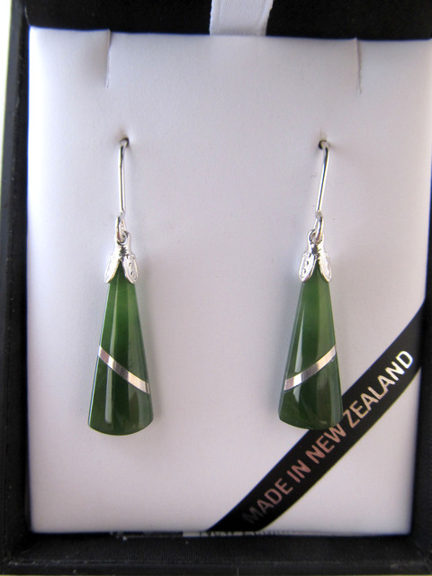 Gorgeous wedge shaped greenstone earrings with silver thread set in silver and hanging on a silver hook.
