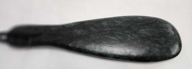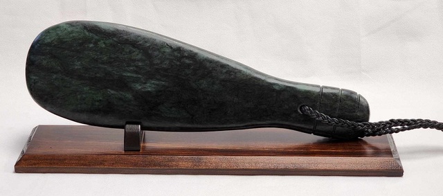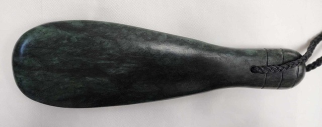 Stunning genuine New Zealand pounamu greenstone mere, hand shaped here in Aotearoa. This piece has a beautiful tapestry of different shades of green woven through it. It has a matt finish and has a heavily plaited cord at one end.
