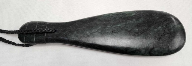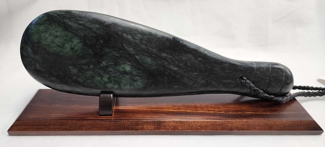 A thick plaited cord is attached to one end and the greenstone patu is presented on a pine base.