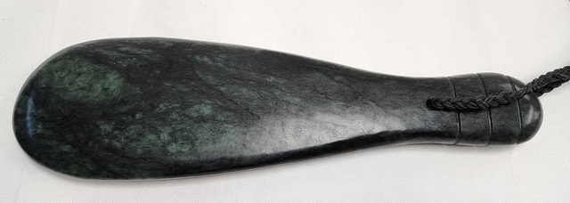 The matt finish on this stunning pounamu mere allows you the luxury of really seeing deep into the stone. The shades of green vary from nearly black through to a creamy mint colour.