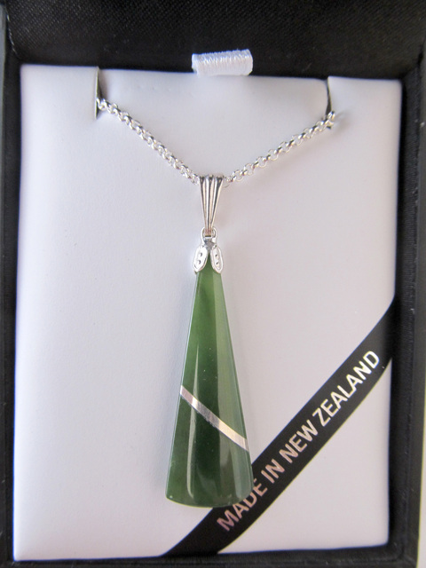 Elegant wedge shaped greenstone pendant with a sterling silver thread running diagonally across the stone. It comes on a sterling silver chain.