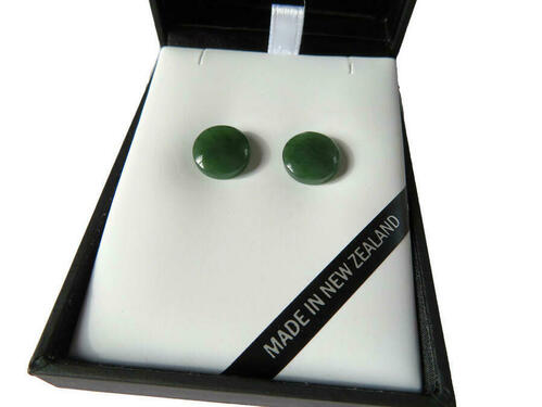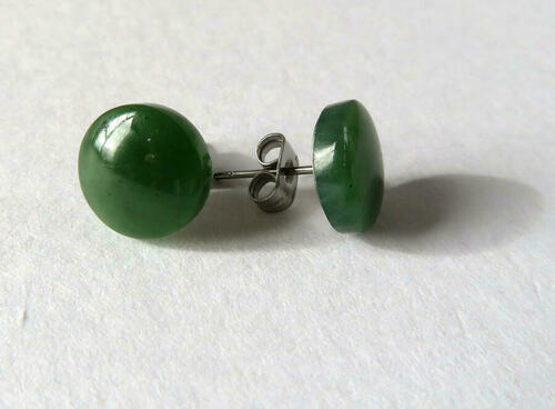 Small (1cm diameter) polished New Zealand greenstone stud earrings with sterling silver findings.