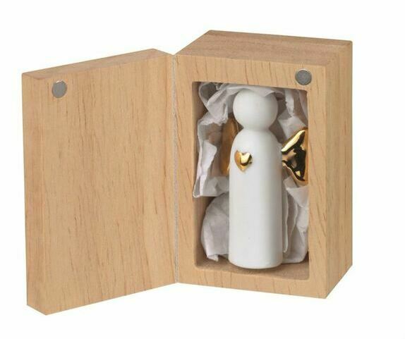 Small handprinted porcelain figure presented in a wooden box with a magnetic closure. Angel is matt white porcelain with metallic gold detail.