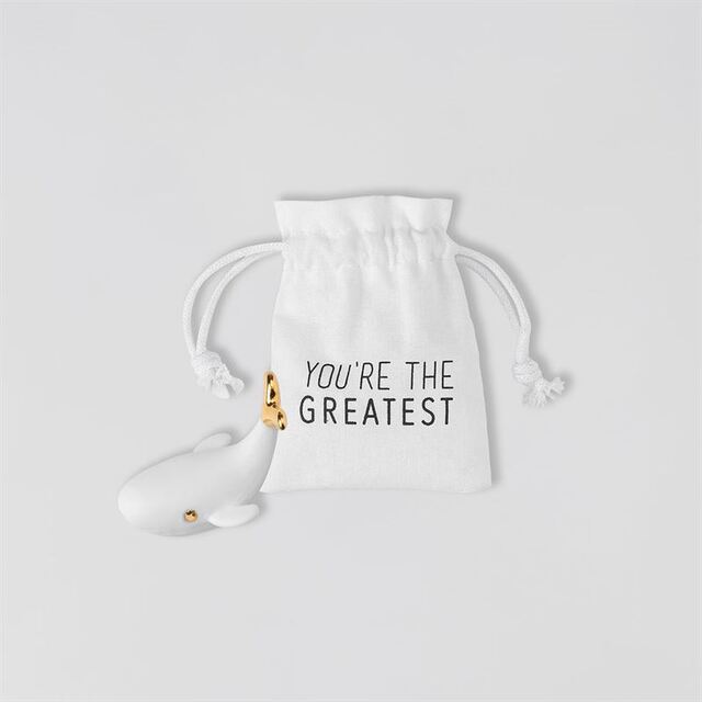 Our Rader Lucky Whale charm is made from white porcelain, unglazed with golden decal.