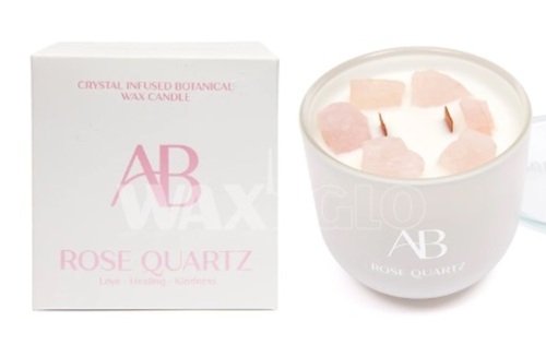 Rose Quartz crystals set in a beautiful scented candle set in a glass vessel. The scent is an infusion of essential oils, featuring, sweet almond oil, sandalwood, ylang ylang and rose geranium.