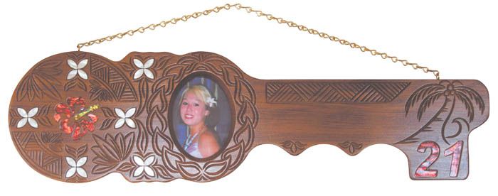 Our stunning Samoan 21st Key features Tapa flowers, Hibiscus, a Palm Tree and a place to put your own photo.