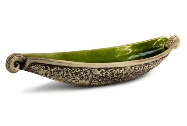 This long, sleek, ceramic bowl has the look of a waka. It has a scroll at each end and a textured finish on its underside. The rich green finish inside is quietly sophisticated, and will look amazing in any room of the house.