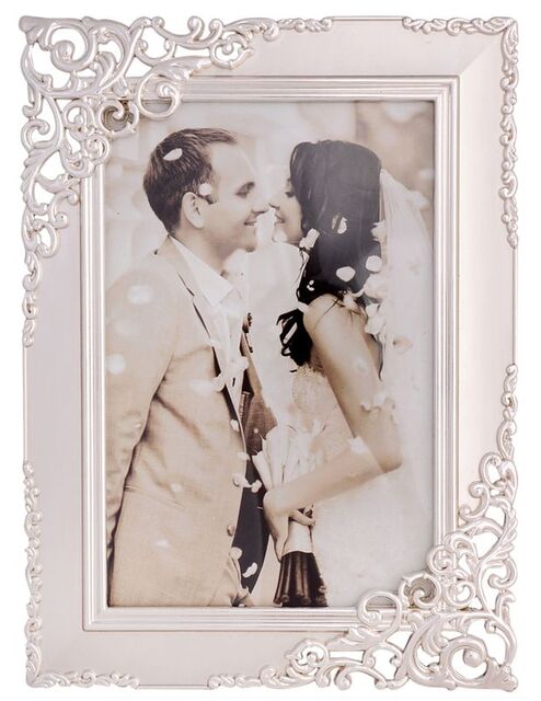 A beautiful frame with timeless elegance. Silver filigree adorns to opposing corners while the frame is finished in a brushed satin.