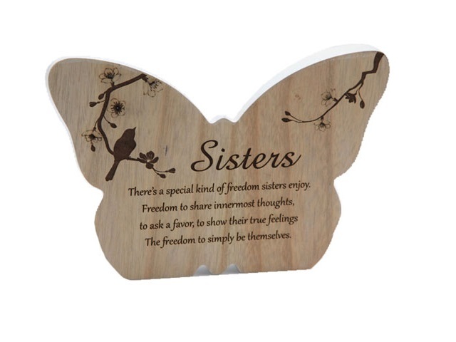 Beautiful butterfly plaque with sweet Sisters verse and pretty bird on branch engraving.