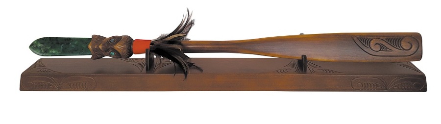 Personalise this special gift by engraving the recipient's name on the Taiaha, or on the base.