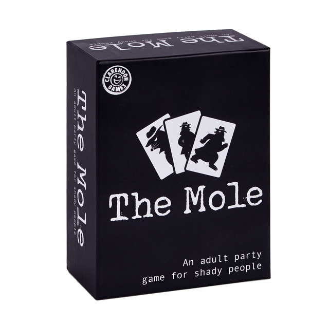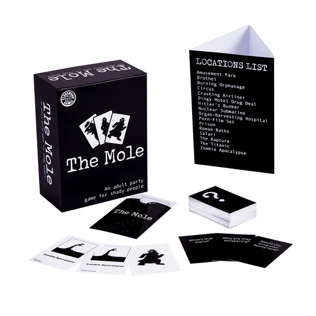 The Mole is a hilarious, naughty, conversation-based game. Question other player to expose their secret identities. Players use observation, bluff and cunning to win. The spies only have a few minutes to identify the mole in one of 16 secret, adult-only locations – while the mole is only ever one incriminating answer away from blowing their cover. Can the mole guess the secret location and foil the plot? Or will the spies unmask the mole in time?