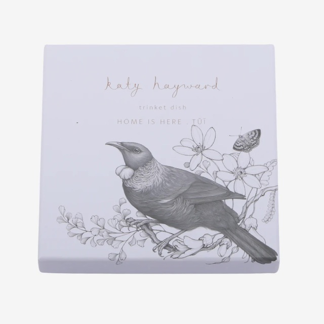Trinket Dish ‘Home is here’, featuring a Tūī bird perched on a wave of Aotearoa, New Zealand native flora, including- Puawananga (clematis), Kawakawa, Mānuka and Kōwhai.