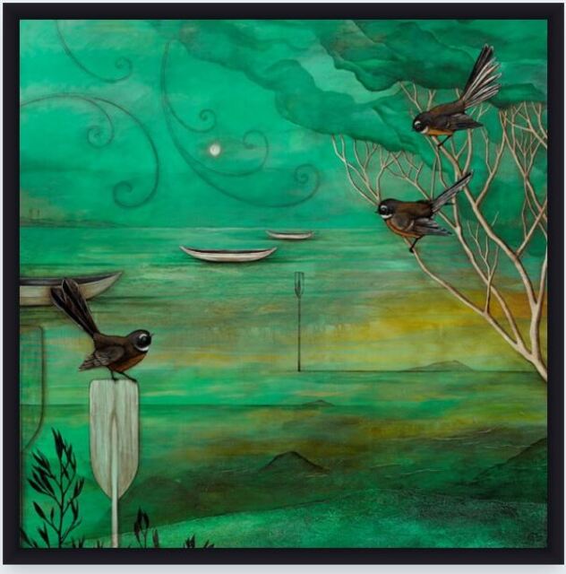 This beautiful artwork by NZ artist Kathryn Furniss comes within a black box frame that can stand alone or be hung.