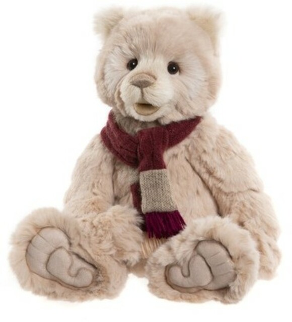Vanilla Pudding's colouring is that of...well, vanilla pudding. Creamy beige, light and fluffy. Delicious! This beautiful bear has a very happy face, with the rare feature of an open mouth, which I particularly like. He is a 5-jointed bear and wears a cosy knitted scarf around his neck.