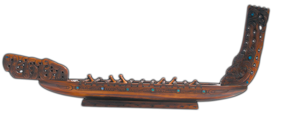 The Waka are characterised by a carved prow and stern depicting important Maori gods, Tangaroa (God of the Sea) with his serpentine body on the prow and Tawhirimatea (God of the Wind and Storms) on the inner curve of the stern overseeing the safety of the paddlers.