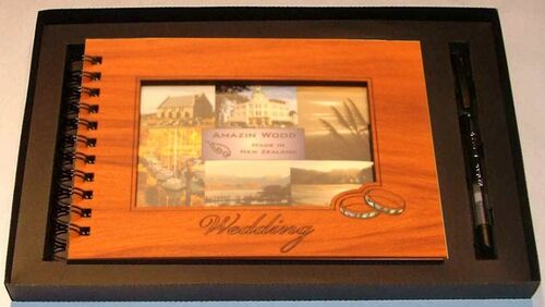 Made here in New Zealand, from native New Zealand timber wooden wedding album features to paua rings on the front, the word Wedding and space for your wedding photo.