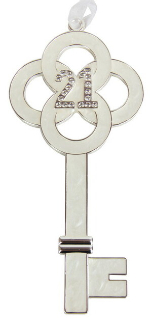 This beautiful, 21st key is filled with a cream-coloured enamel, giving it a mother-of-pearl look. The '21' is in diamante and an organza ribbon is attached to the top making it easy to hang.