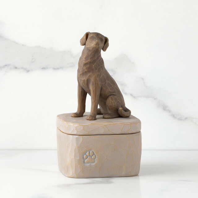 8.5cmH carved figurine of large dark dog affixed to lid of 5.5cmH grey box