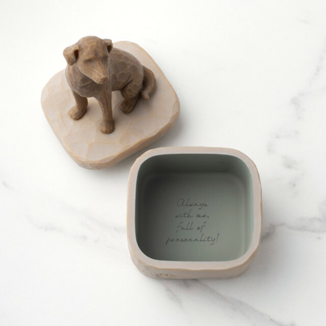 A gift for those who love dogs and treasure their companionship. Keepsake Boxes are small, sweet places to keep jewellery, accessories, notes. Inside, the bottom of this box reveals the sentiment, "Always with me, full of personality!"