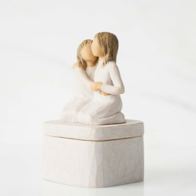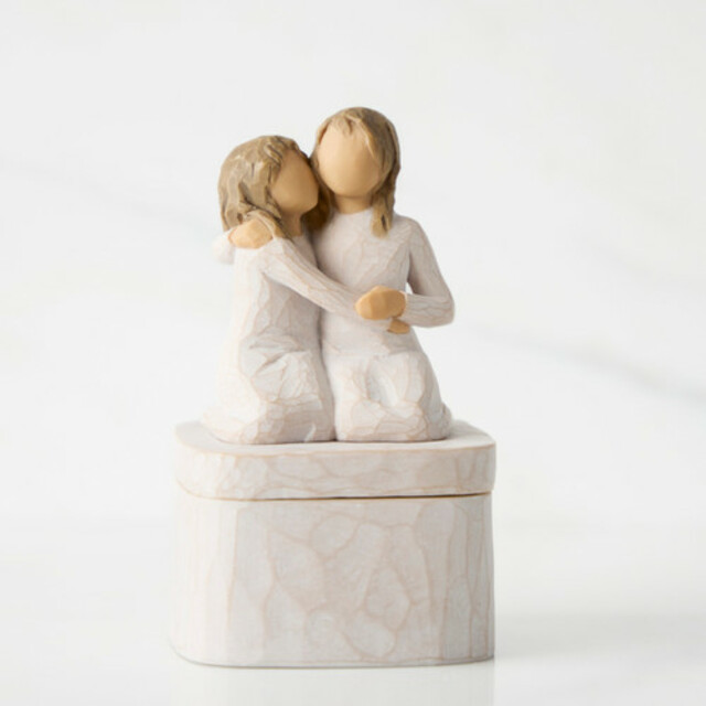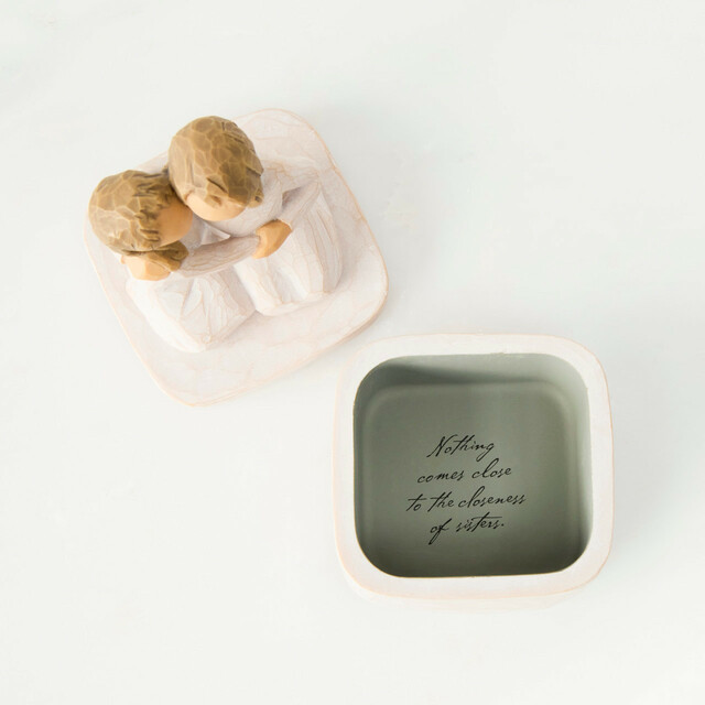 A gift for sisters or friends, or for parents of daughters. Carved figurative sculpture forms the lid of the Keepsake Box. Box holds jewellery, hair accessories, small objects and treasures. Inside, bottom of box reveals the sentiment,
